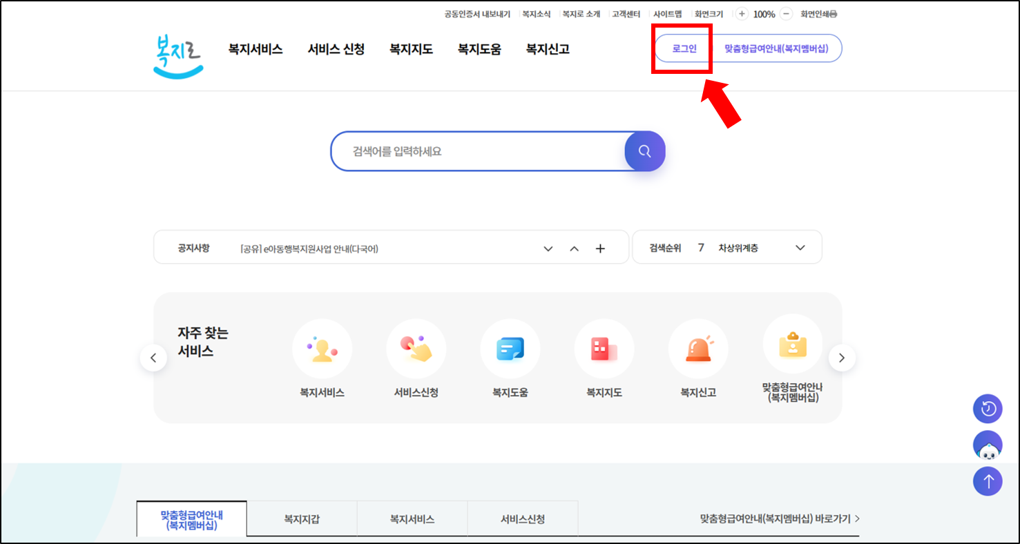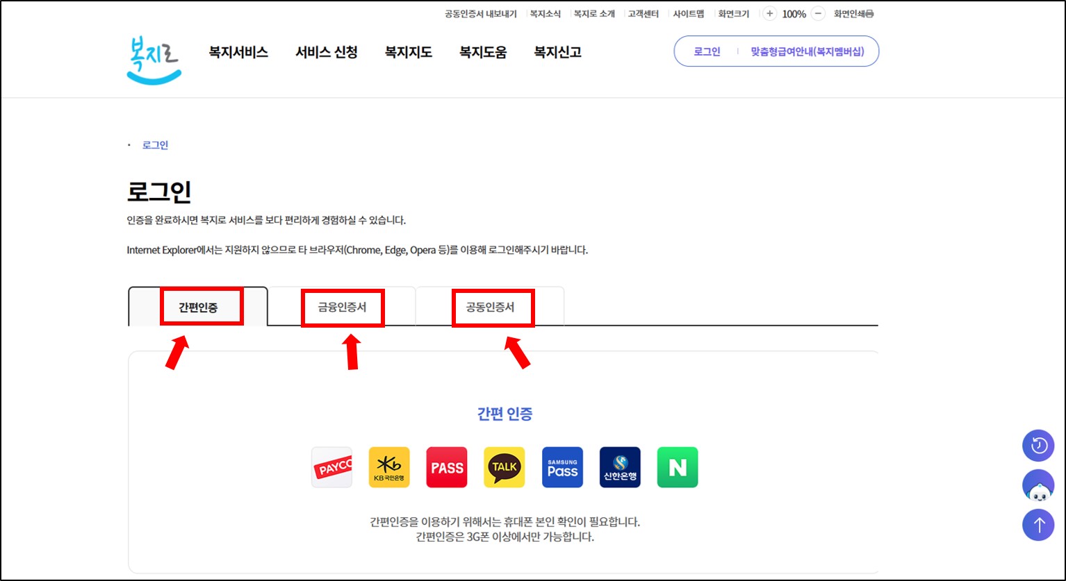복지로 홈페이지에 들어가서 우측 상단의 로그인을 클릭한 후 '간편인증', '금융인증서', '공동인증서' 중 한 가지를 선택하여 로그인 합니다,.