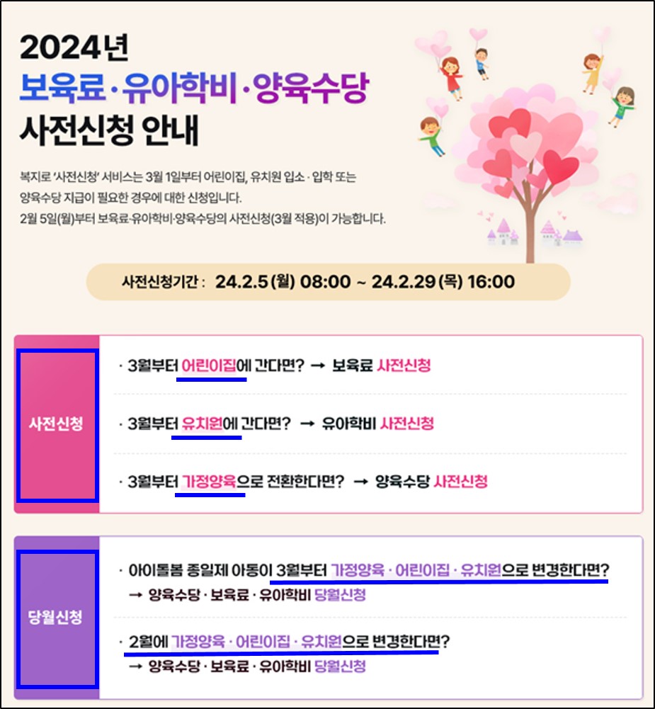 영유아 보육서비스 사전신청 기간 마감일이 다가왔습니다. 해당되시는 분들은 놓치지 마시고 꼭 혜택 받으세요. 3월부터 어린이집, 유치원, 가정양육으로 전환된다면 모두 사전신청에 해당됩니다.