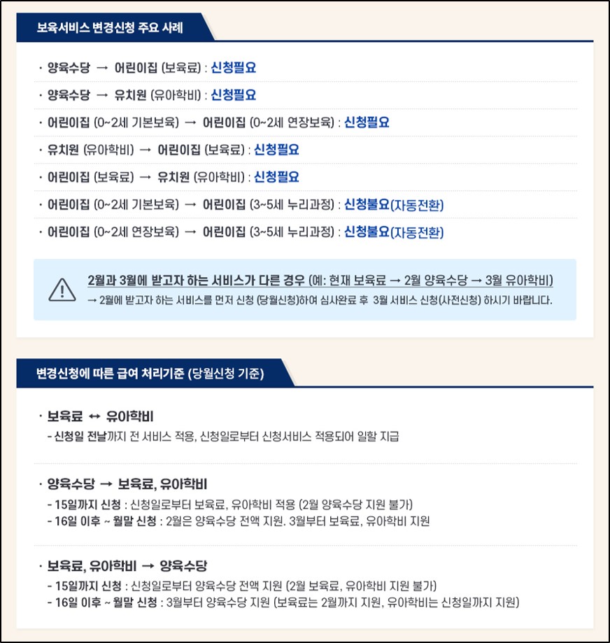 - 양육수당을 수령하다가 어린이집 보육료나 유치원 유아학비로 변경하는 경우