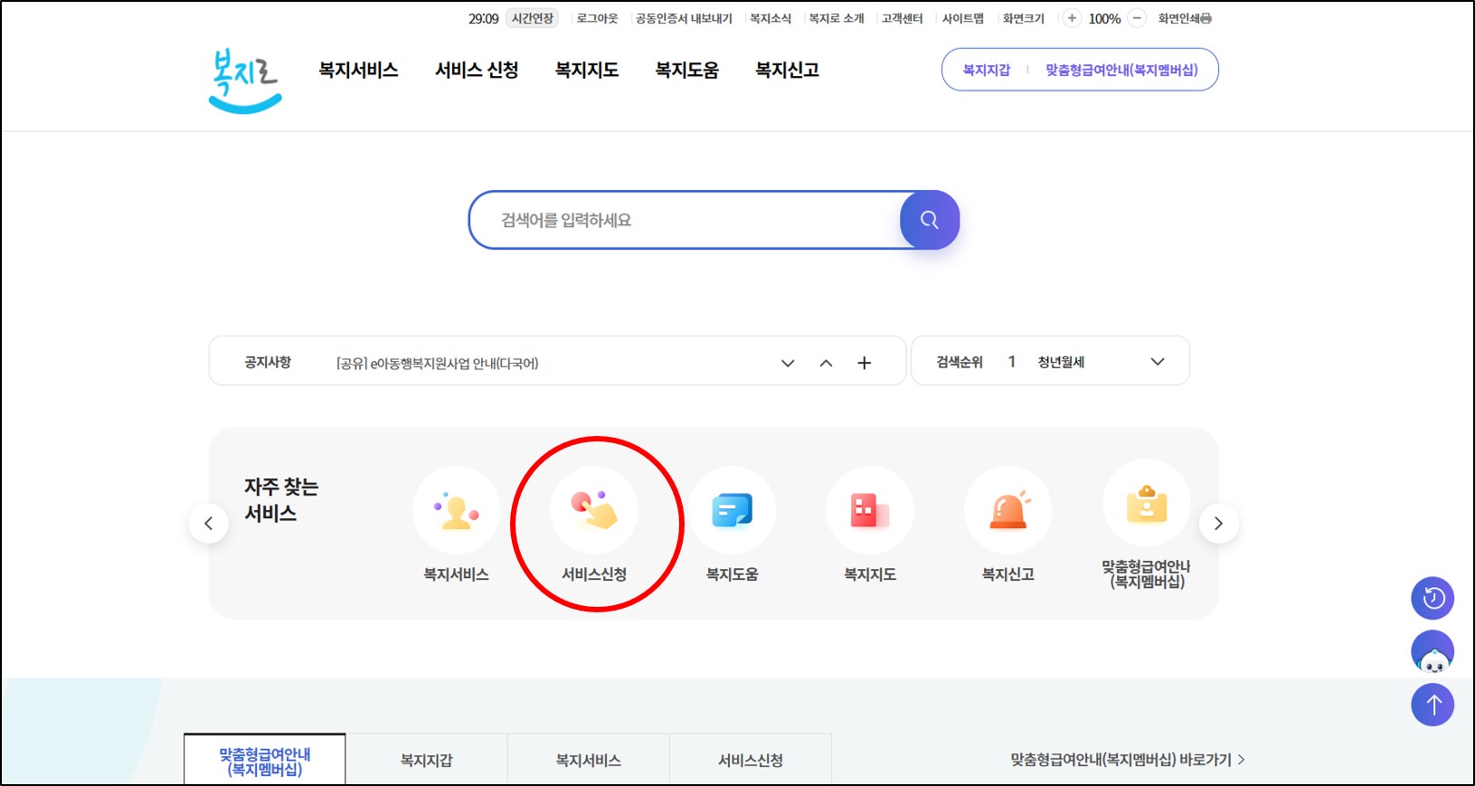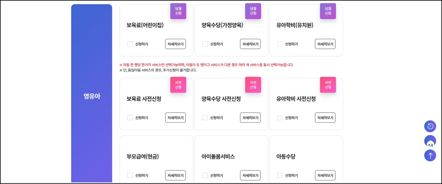 로그인에 성공하여 들어간 화면에서 '서비스 신청'을 클릭하여 들어가면 영유아 관련 신청 버튼들이 나타납니다.